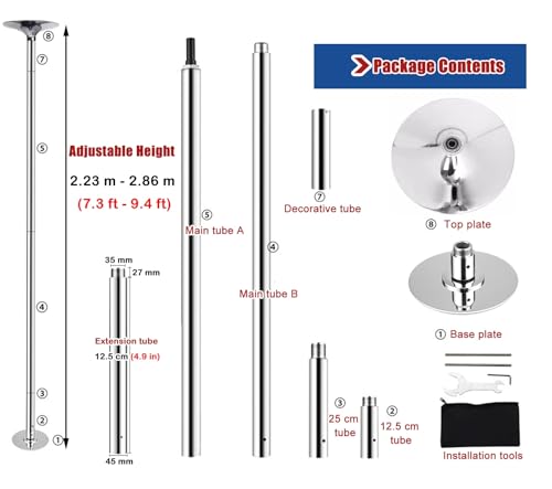 La Barre de Pole Dance est disponible en plusieurs hauteurs ajustables : de 2,23 m à 2,74 m (7,3 pi à 9 pi), et jusqu’à 3,74 m (12,3 pi) avec des tiges d’extension, ce qui la rend adaptable à divers plafonds. Ajustez facilement la hauteur de la barre pour un confort optimal pendant votre entraînement.