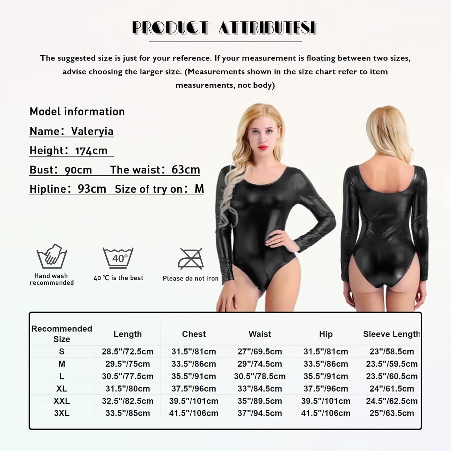 • Design : Justaucorps de danse wetlook pour adultes femmes, tissu extensible. Manches longues, encolure dégagée, coupe haute et slim.